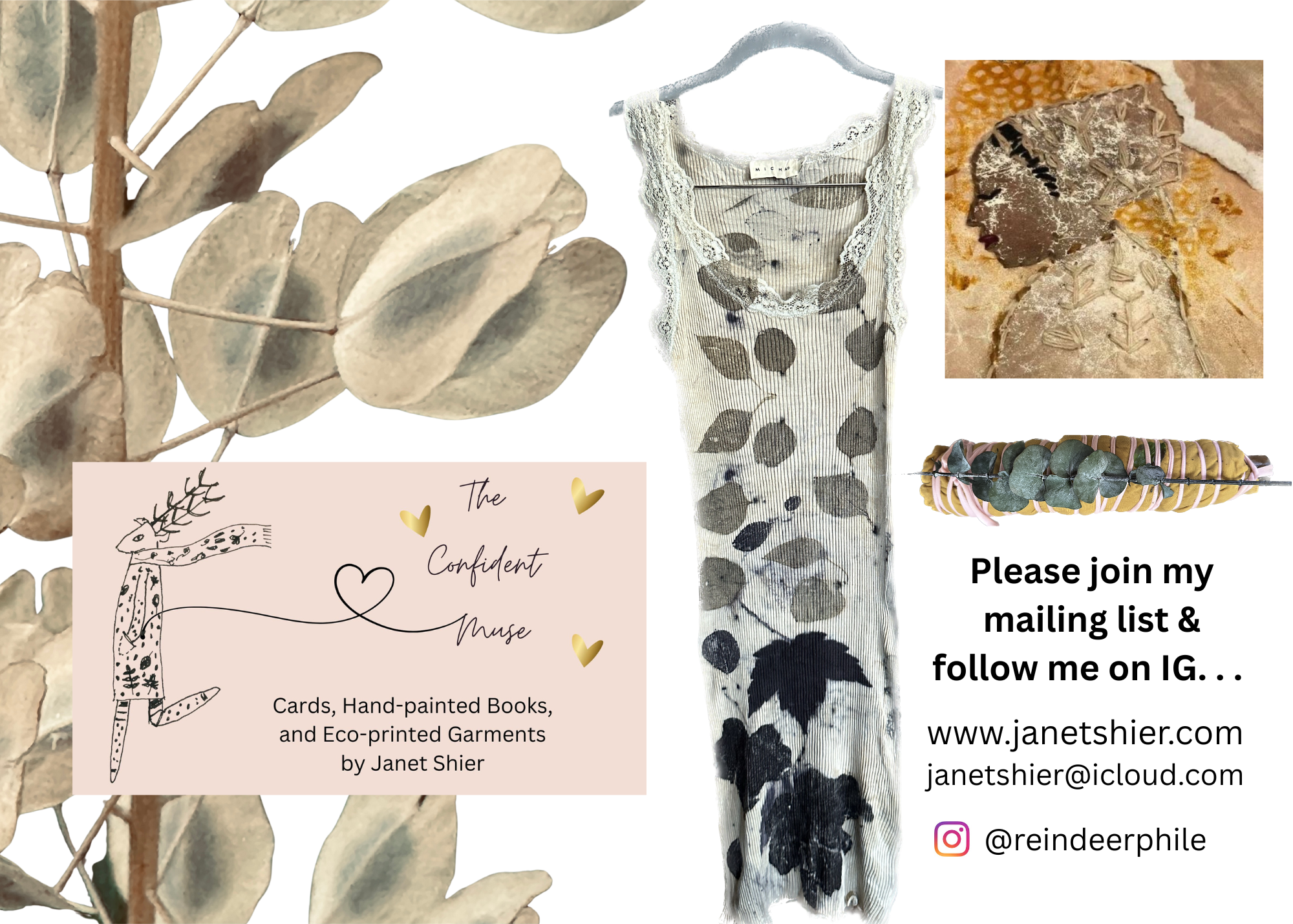 Currently, I do not sell my paintings, but if you follow my "shop” and get on my mailing list, I will keep you updated about sales of my eco-dyed garments, hand-made books, and cards featuring my photography and art. In the warmer seasons, I will offer visual journaling workshops for up to 6 participants. Thank you visiting my site!